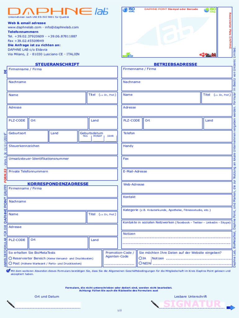 Reservierter Plate DAPHNEUnternehmen each UNI EN ISO 9001 fr Qualities & email address www.daphnelab.com info daphnelab.com Telefonnummern Tel. +39.02.37920609 +39.06.87811887 Fax +39.02.45509949