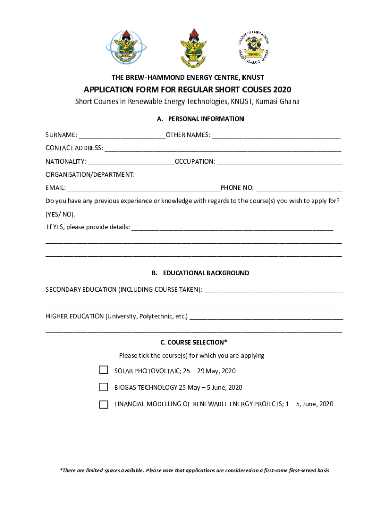 THE BREWHAMMOND ENERGY Center, KNUSTAPPLICATION FORM FOR REGULAR SHORT HOUSES 2020 Short Courses in Renewable Energy Technologies, ONUST, Quasi Ghana A. PERSONAL INFORMATION SURNAME: OTHER NAMES: