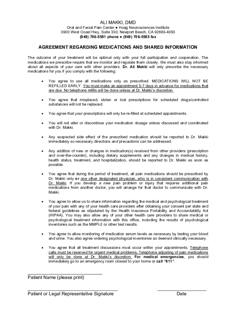ALI MAKE, DMD Oral and Facial Pain Center Hoax Neurosciences Institute 3900 West Coast Hwy, Suite 330, Newport Beach, CA 926634093 (949) 7065581 phone (949) 7065585 agreement REGARDING MEDICATIONS