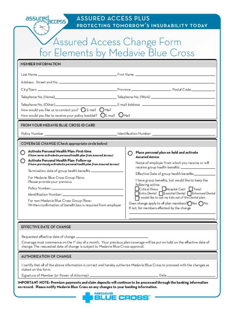 ASSURED ACCESS PLUS protecting tomorrow's insurability todayAssured Access Change Form for Elements by Melanie Blue Cross MEMBER INFORMATION Last NameFirst Headdress Street and No. City/TownProvinceTelephone