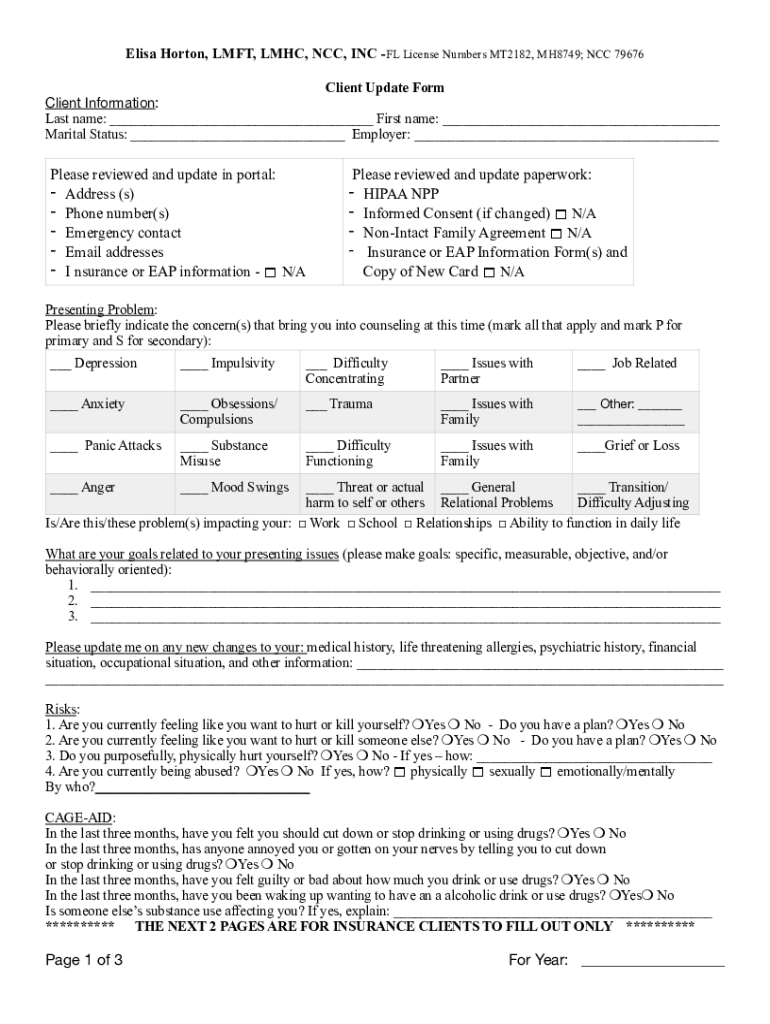 Elisa Horton, LEFT, MHC, NCC, INC FL License Numbers MT2182, MH8749; NCC 79676 Client Update Form Client Information:Last name: First name: Marital Status: Employer: Please review and update in portal: