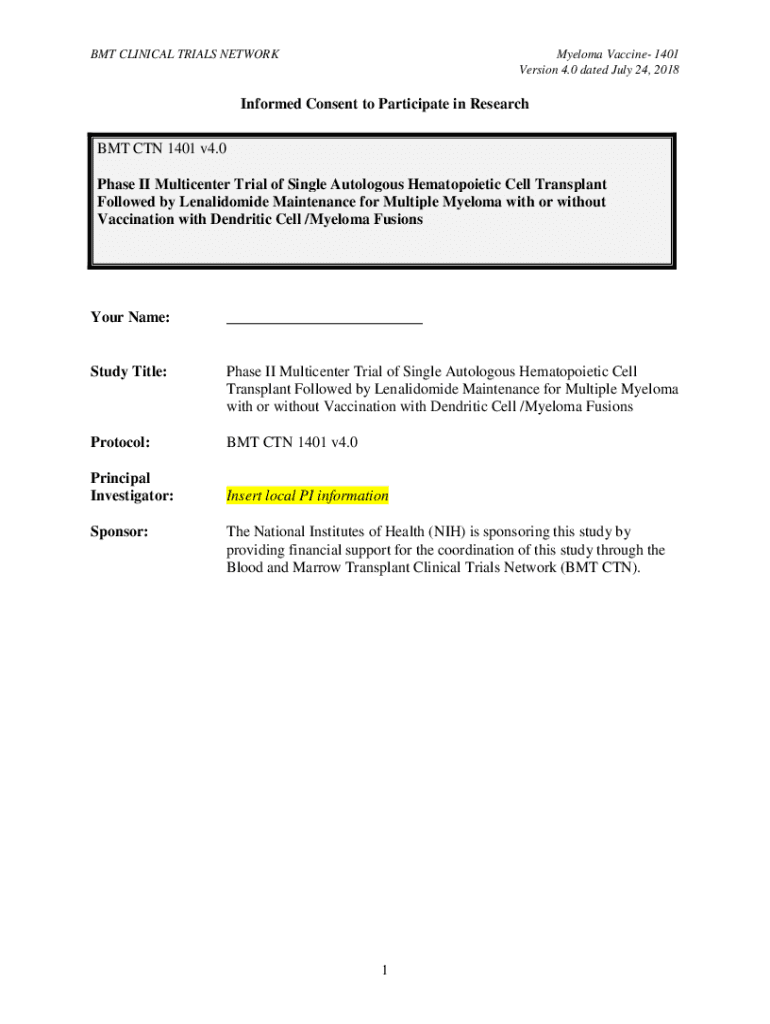 BMT CLINICAL TRIALS NETWORKMyeloma Vaccine 1401 Version 4.0 dated July 24, 2018Informed Consent to Participate in Research BMT CTN 1401 v4.0 Phase II Multi center Trial of Single Autologous Hematopoietic