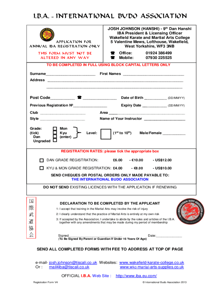 I.B.A.INTERNATIONAL BUD ASSOCIATIONAPPLICATION FOR ANNUAL IBA REGISTRATION ONLYJOSH JOHNSON (HARSH) 9th Dan Hans hi IBA President & Licensing Officer Wakefield Karate and Martial Arts College 5 Valentine