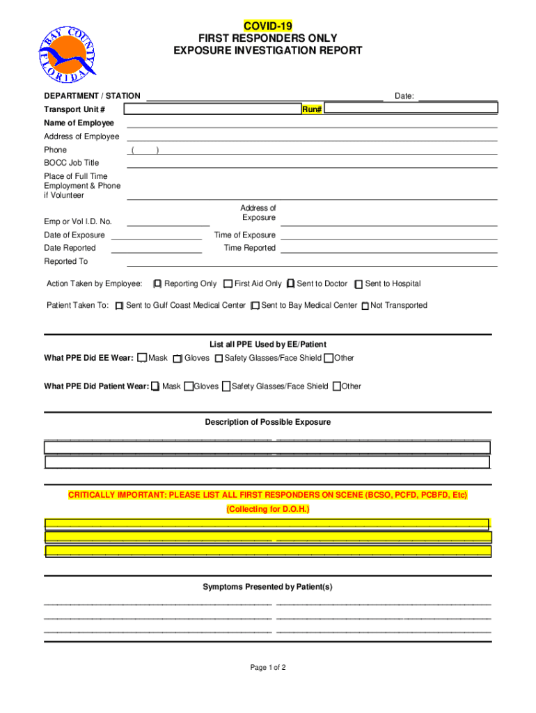 COVID-19 FIRST RESPONDERS ONLY EXPOSURE INVESTIGATION REPORTDEPARTMENT / Stationary:Transport Unit #Run#Name of Employee Address of Employee Phone()BOCK Job Title Place of Full Time Employment & Phone