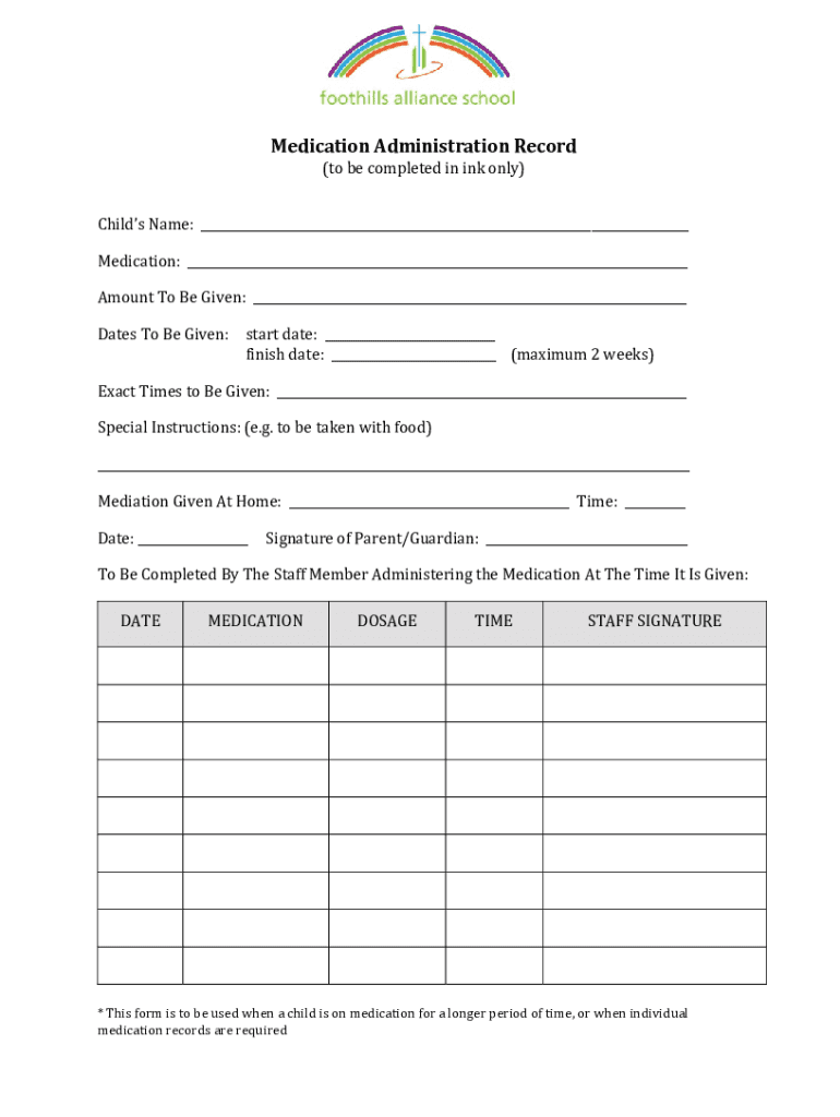 Medication Administration Record (to be completed in ink only)Child's Name: Medication: Amount To Be Given: Dates To Be Given:start date: finish date: (maximum 2 weeks)Exact Times to Be Given: Special