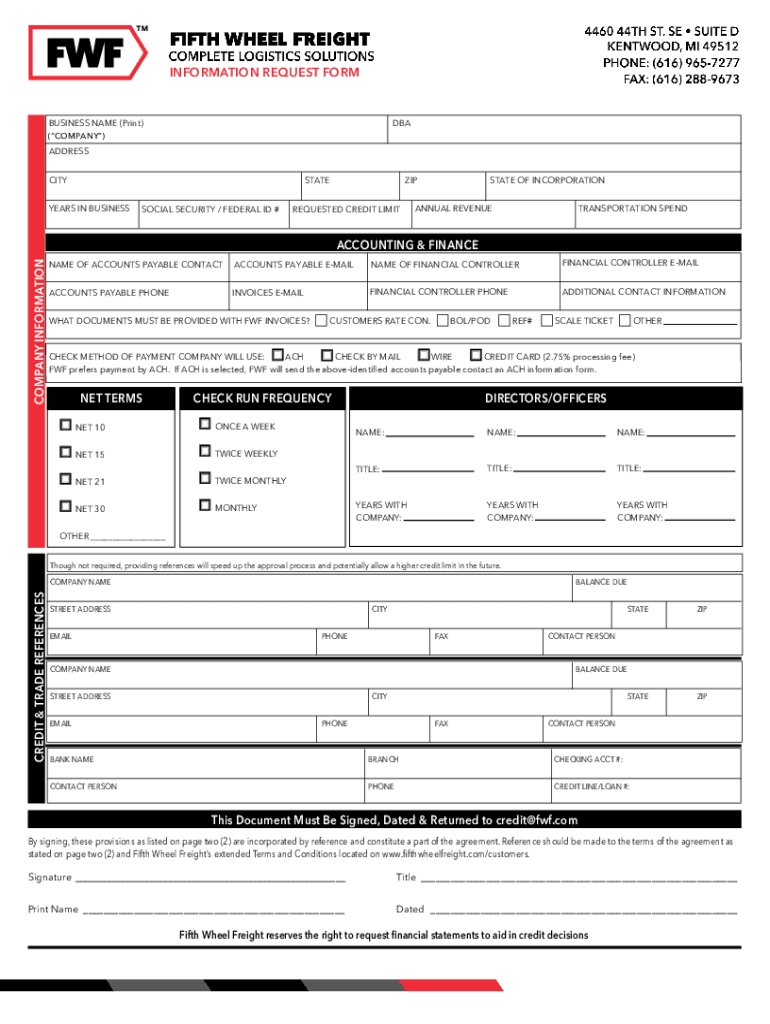 INFORMATION REQUEST AGRIBUSINESS NAME (Print)DBA(COMPANY)ADDRESSCITYSTATEYEARS IN BUSINESSSOCIAL SECURITY / FEDERAL ID #STATE OF INCORPORATIONZIPREQUESTED CREDIT SEMIANNUAL REVENUETRANSPORTATION SPENDACCOUNTING