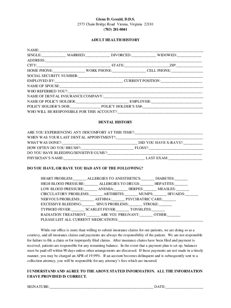 Glenn D. Gerald, D.D.S. 2573 Chain Bridge Road Vienna, Virginia 22181 (703) 2810041 ADULT HEALTH HISTORY NAME: SINGLE: MARRIED: DIVORCED: WIDOWED: ADDRESS: CITY: STATE: ZIP: HOME PHONE: WORK PHONE: