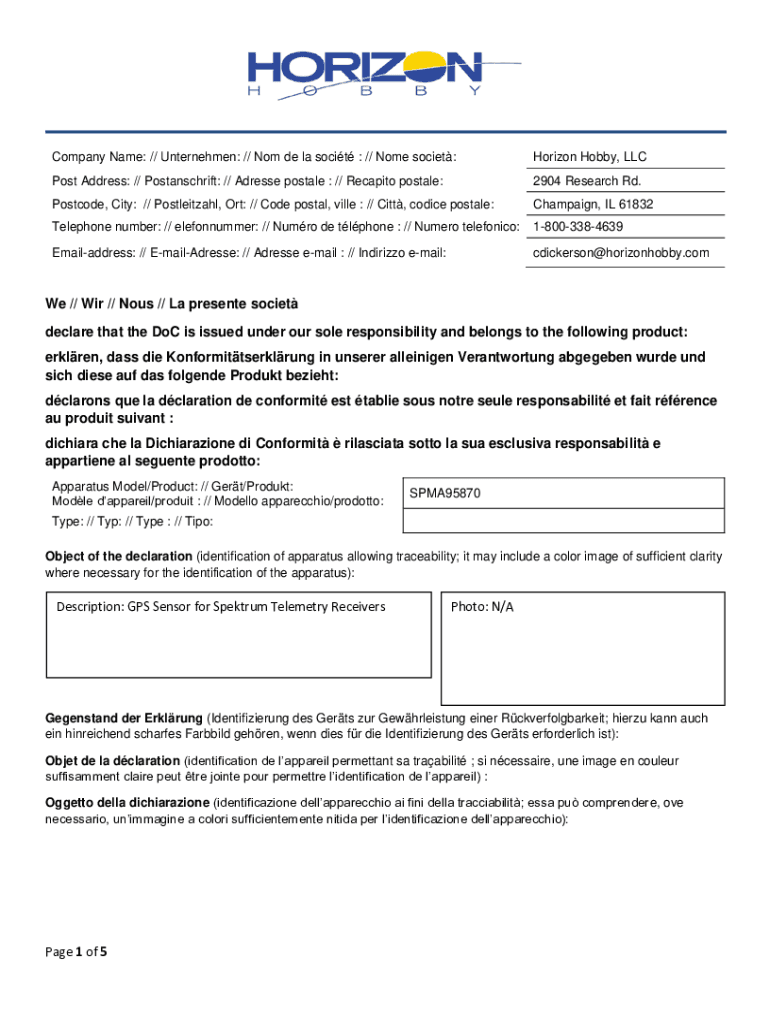 Company Name: // Unternehmen: // Not DE la so cit : // Nome society:Horizon Hobby, LLC Post Address: // Postanschrift: // Address postal : // Receipt postal:2904 Research Rd. Postcode, City: // Postnatal,