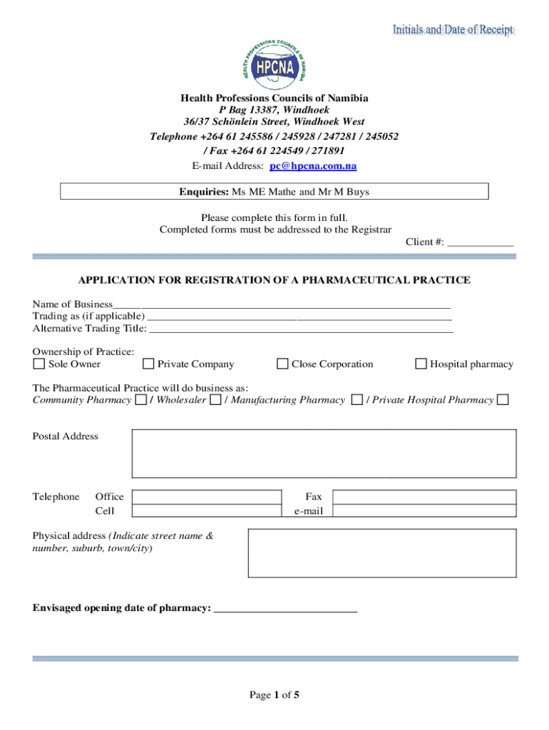Health Professions Councils of Namibia P Bag 13387, Windhoek 36/37 Scholar Street, Windhoek West Telephone +264 61 245586 / 245928 / 247281 / 245052 / Fax +264 61 224549 / 271891 Email Address: PC