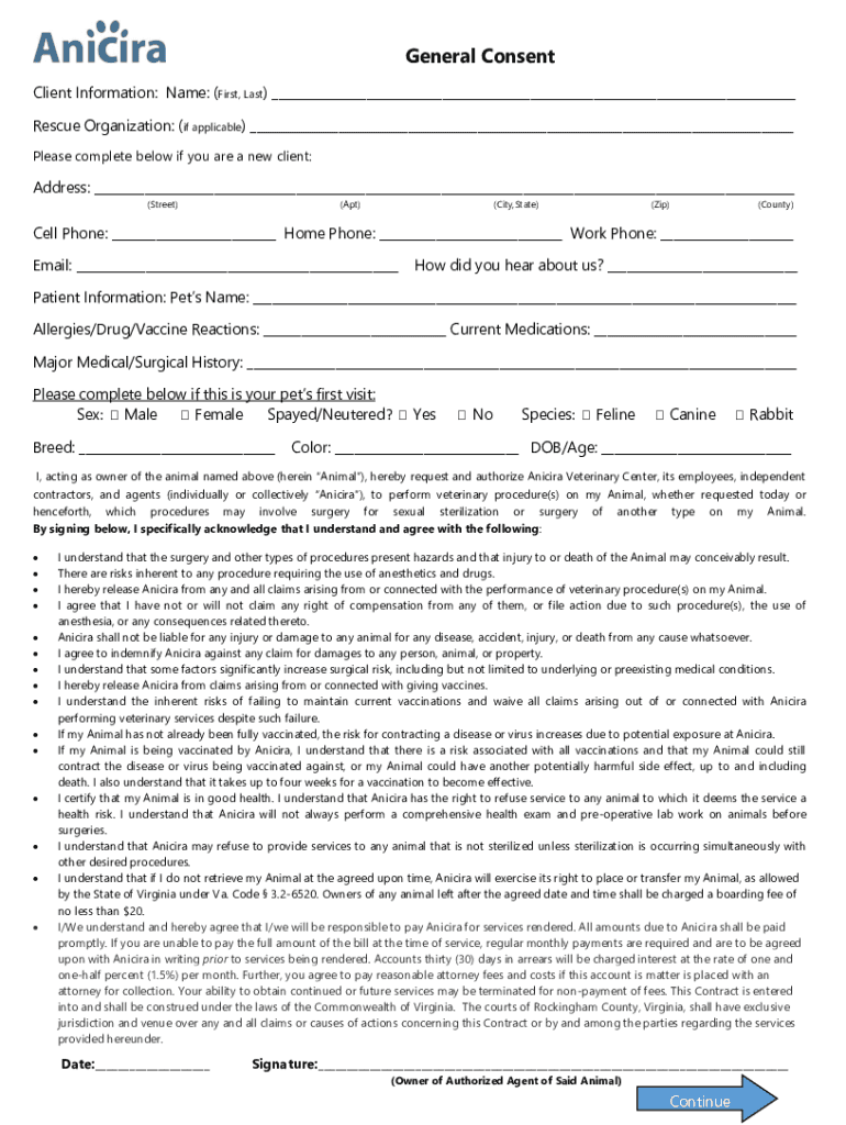 General Consent Client Information: Name: (First, Last) Rescue Organization: (if applicable) Please complete below if you are a new client:Address: (Street)(Apt)(City, State)(Zip)(County)Cell Phone: