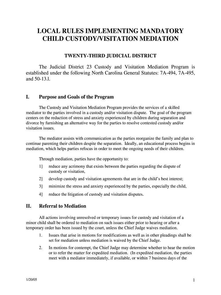 LOCAL RULES IMPLEMENTING MANDATORY CHILD CUSTODY/VISITATION MEDIATION TWENTYTHIRD JUDICIAL DISTRICT The Judicial District 23 Custody and Visitation Mediation Program is established under the following