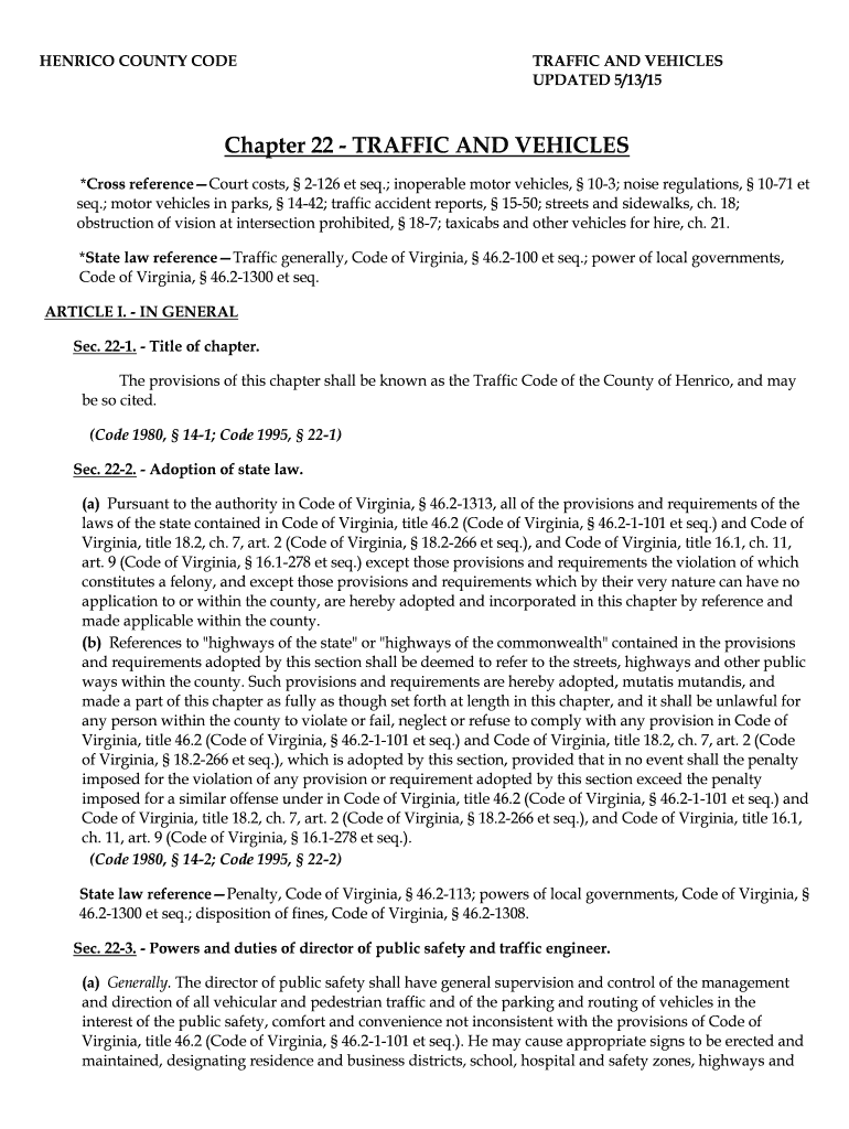 HENRICO COUNTY CODETRAFFIC AND VEHICLES UPDATED 5/13/15Chapter 22 TRAFFIC AND VEHICLES *Cross referenceCourt costs, 2126 et seq.; inoperable motor vehicles, 103; noise regulations, 1071 et seq.; motor