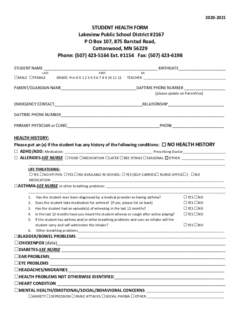 20202021STUDENT HEALTH FORM Lake view Public School District #2167 P O Box 107, 875 Bars tad Road, Cottonwood, MN 56229 Phone: (507) 4235164 Ext. #1154 Fax: (507) 4236198 STUDENT NAME BIRTHDATE LAST
