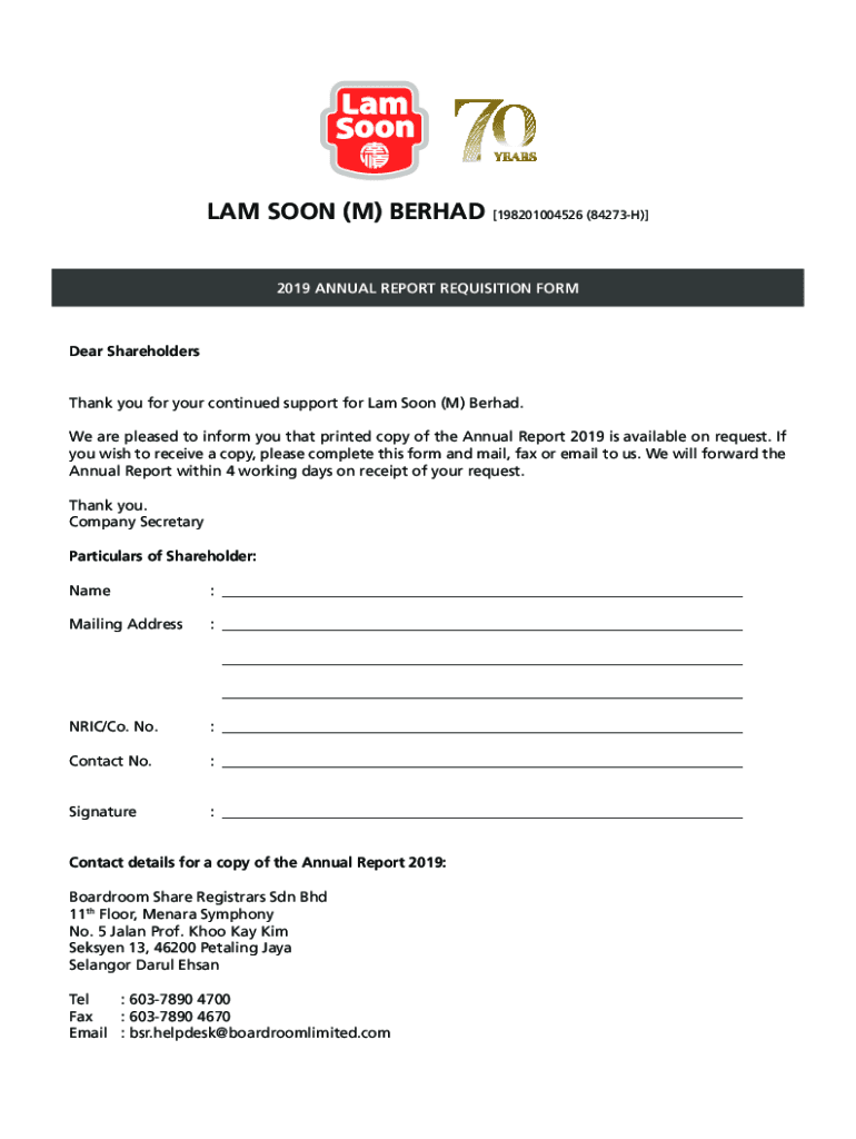 LAM SOON (M) BROAD 198201004526 (84273H) 2019 ANNUAL REPORT REQUISITION Former Shareholders Thank you for your continued support for Lam Soon (M) Broad. We are pleased to inform you that printed copy