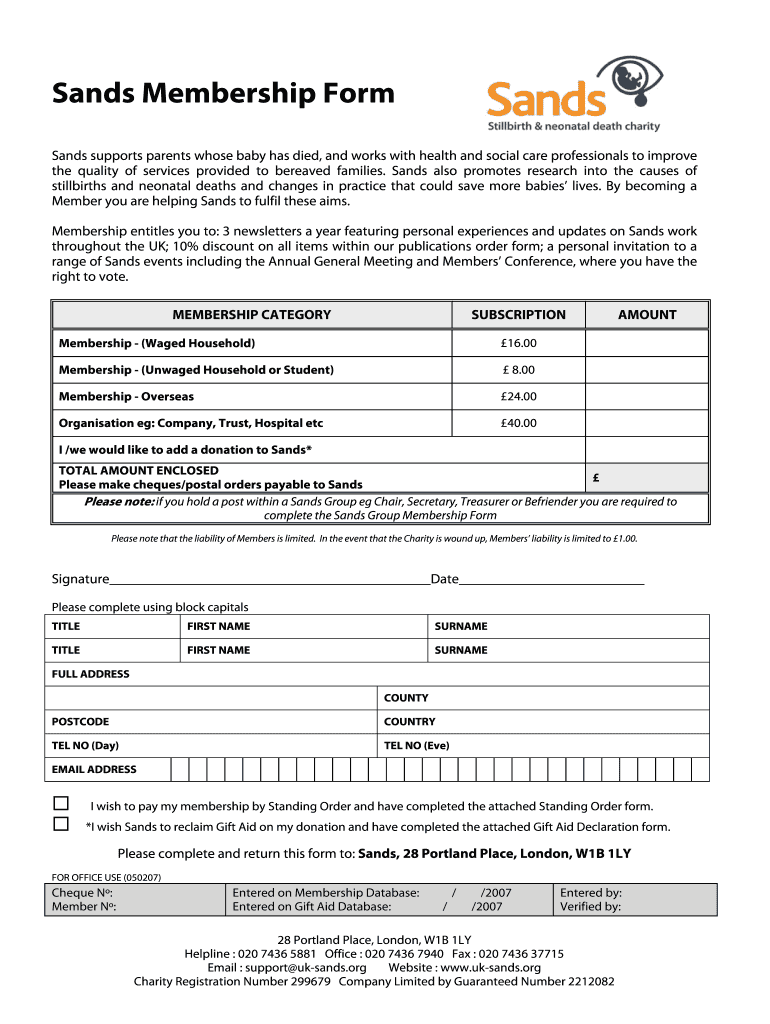 Sands Membership Form Sands supports parents whose baby has died, and works with health and social care professionals to improve the quality of services provided to bereaved families. Sands also promotes