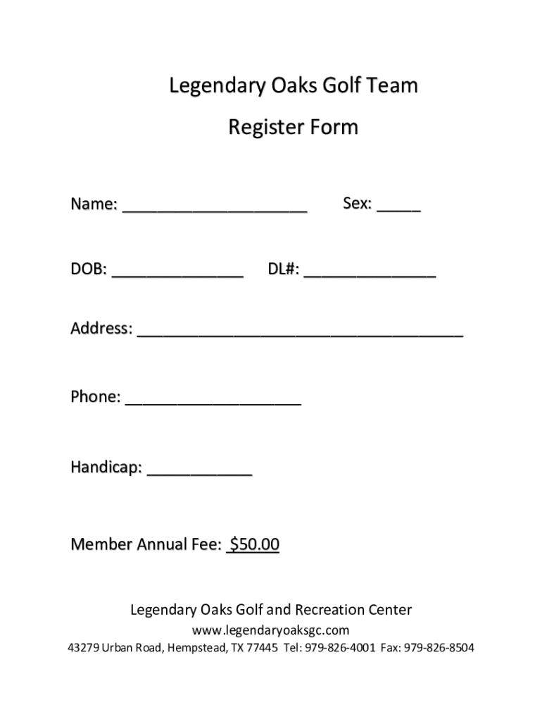 Legendary Oaks Golf Team Register Form Name: DOB: Sex: DL#: Address: Phone: Handicap: Member Annual Fee: $50.00Legendary Oaks Golf and Recreation Center www.legendaryoaksgc.com 43279 Urban Road, Hempstead,