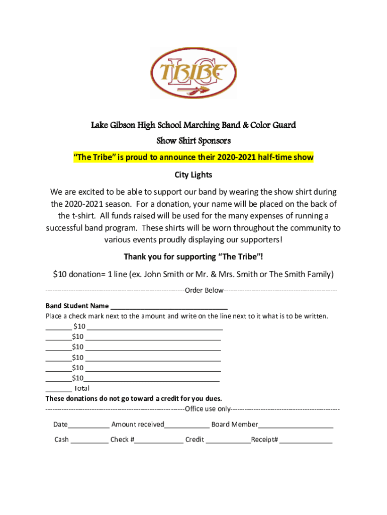 Lake Gibson High School Marching Band & Color Guard Show Shirt Sponsors The Tribe is proud to announce their 20202021 halftime show City Lights We are excited to be able to support our band by wearing