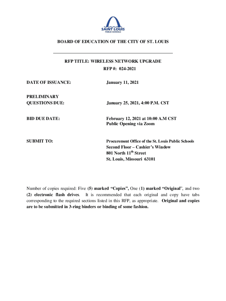 BOARD OF EDUCATION OF THE CITY OF ST. LOUIS RFP TITLE: WIRELESS NETWORK UPGRADE RFP #: 0242021 DATE OF ISSUANCE:January 11, 2021PRELIMINARY QUESTIONS DUE:January 25, 2021, 4:00 P.M. CST BID DUE DATE:February
