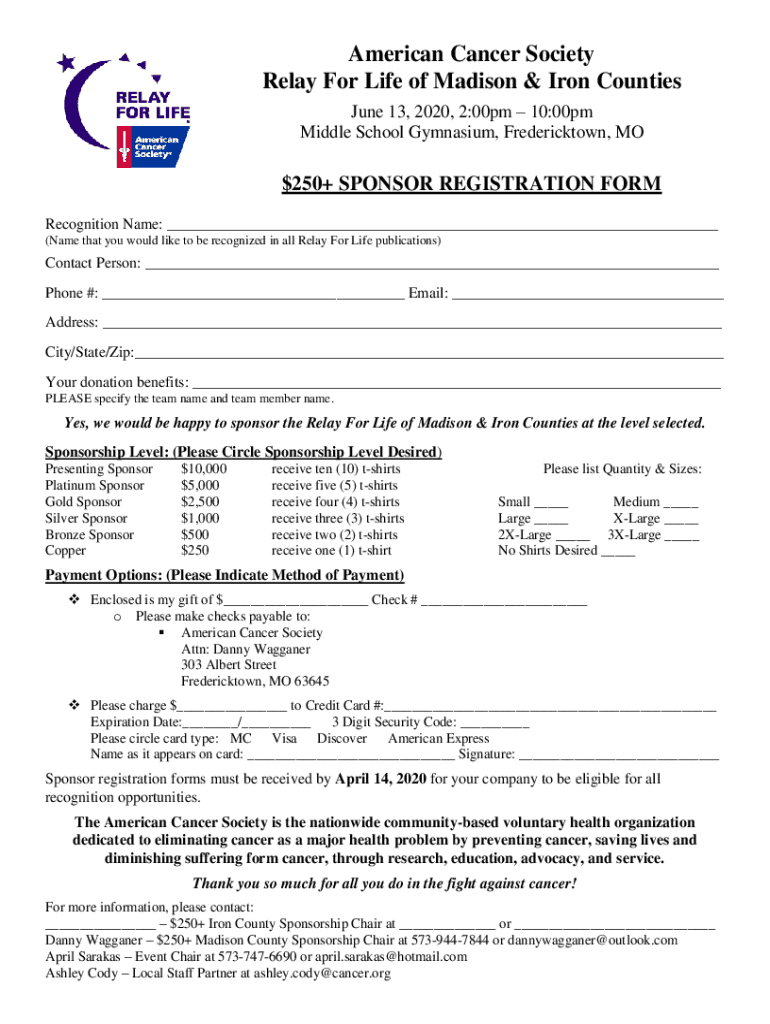 American Cancer Society Relay For Life of Madison & Iron Counties June 13, 2020, 2:00pm 10:00pm Middle School Gymnasium, Frederick town, MO$250+ SPONSOR REGISTRATION FORM Recognition Name: (Name that