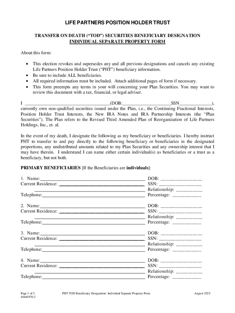 LIFE PARTNERS POSITION HOLDER TRUST TRANSFER ON DEATH (TOD) SECURITIES BENEFICIARY DESIGNATION INDIVIDUAL SEPARATE PROPERTY FORM About this form: This election revokes and supersedes any and all previous