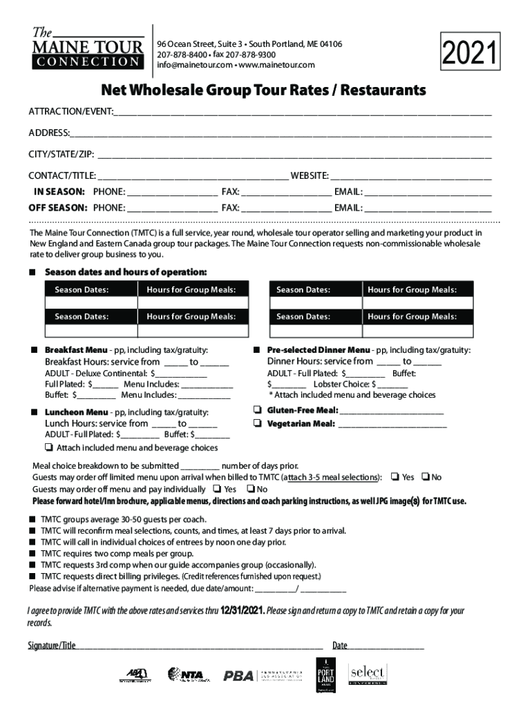 Tremaine TOUR CONNECTION202196 Ocean Street, Suite 3 South Portland, ME 04106 2078788400 fax 2078789300 info mainetour.com www.mainetour.comNet Wholesale Group Tour Rates / Restaurants ATTRACTION/EVENT: