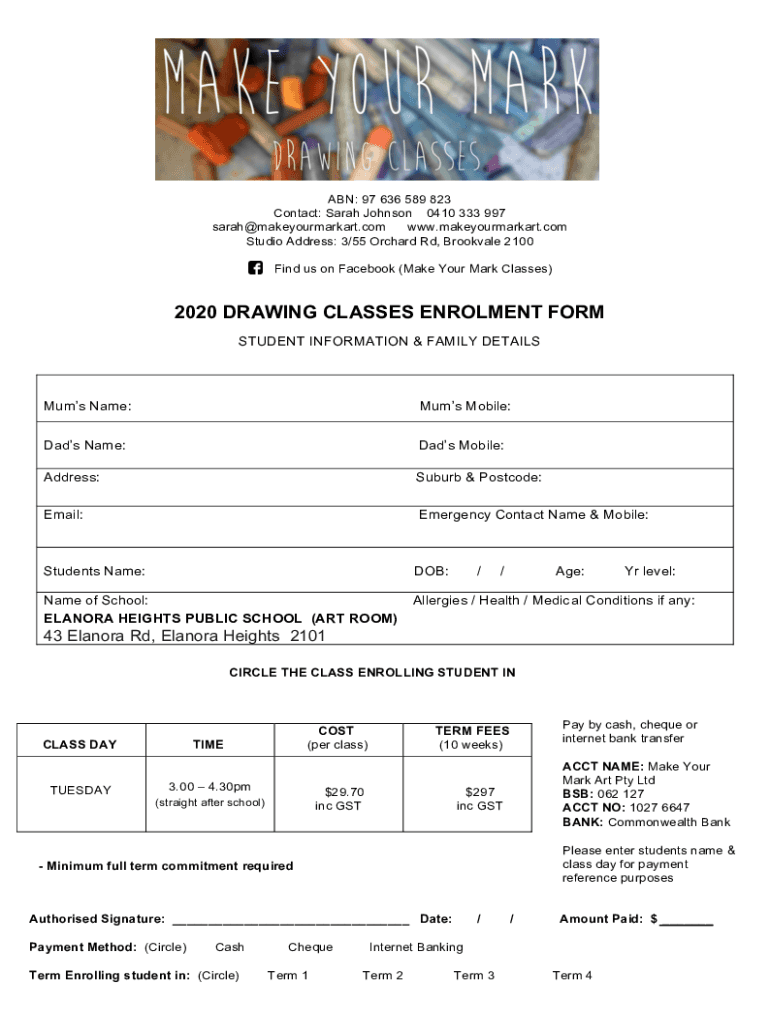 ABN: 97 636 589 823 Contact: Sarah Johnson 0410 333 997 Sarah makeyourmarkart.com www.makeyourmarkart.com Studio Address: 3/55 Orchard Rd, Brook vale 2100 Find us on Facebook (Make Your Mark Classes)2020