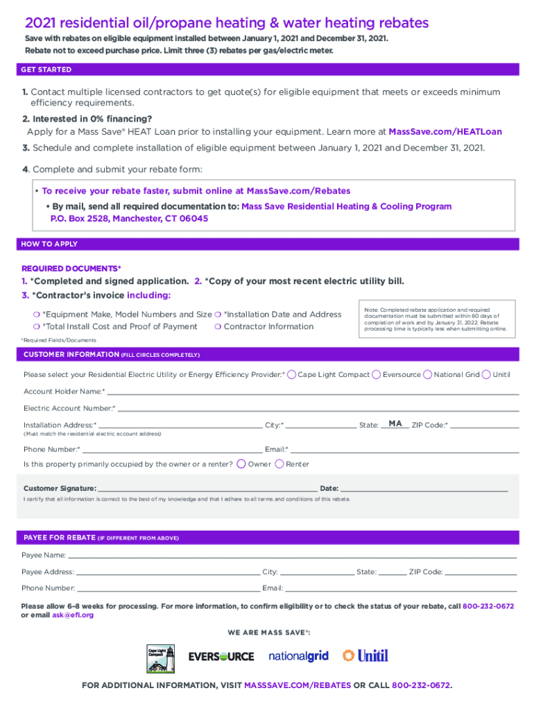 2021 Residential oil/propane heating & water heating rebate form ARE MASS SAVE:2021 residential oil/propane heating & water heating rebates Save with rebates on eligible equipment installed between