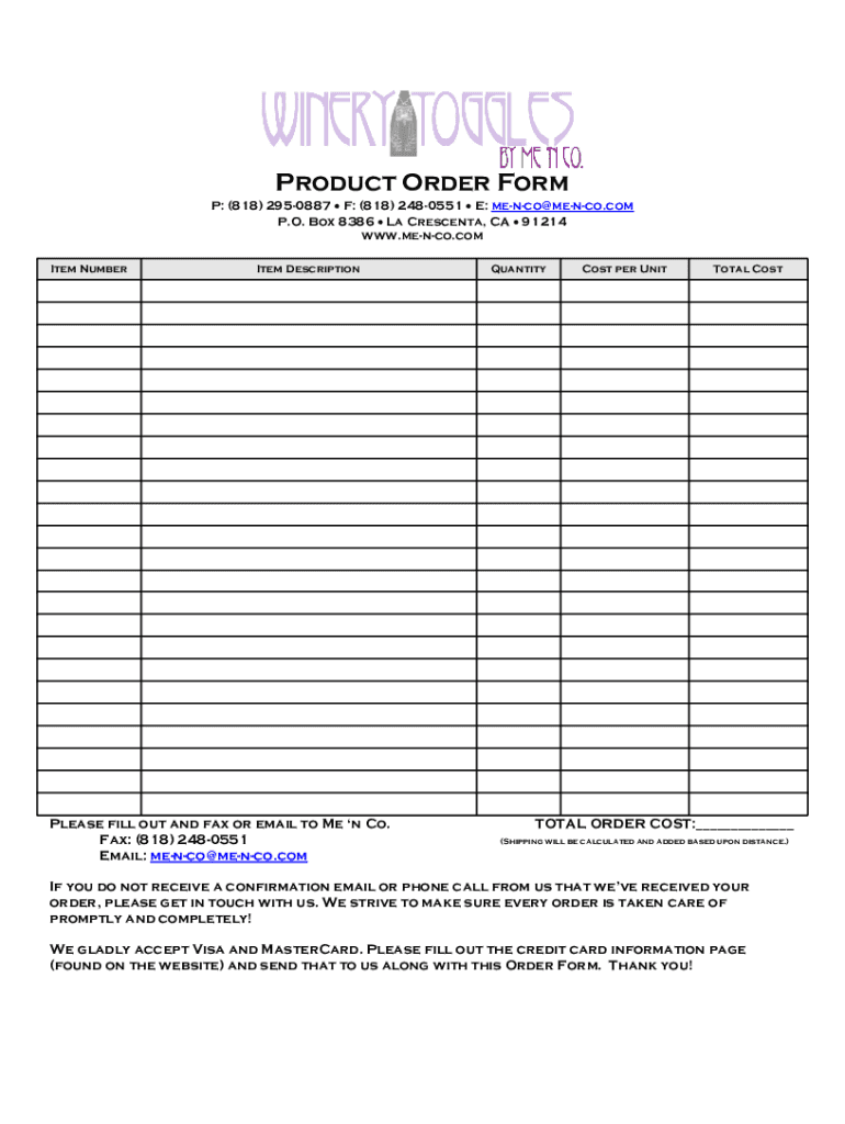Product Order Form P: (818) 2950887 F: (818) 2480551 E: menco.com P.O. Box 8386 La Crescent, CA 91214 www.menco.com Item Numbered DescriptionPlease fill out and fax or email to Me n Co. Fax: (818)