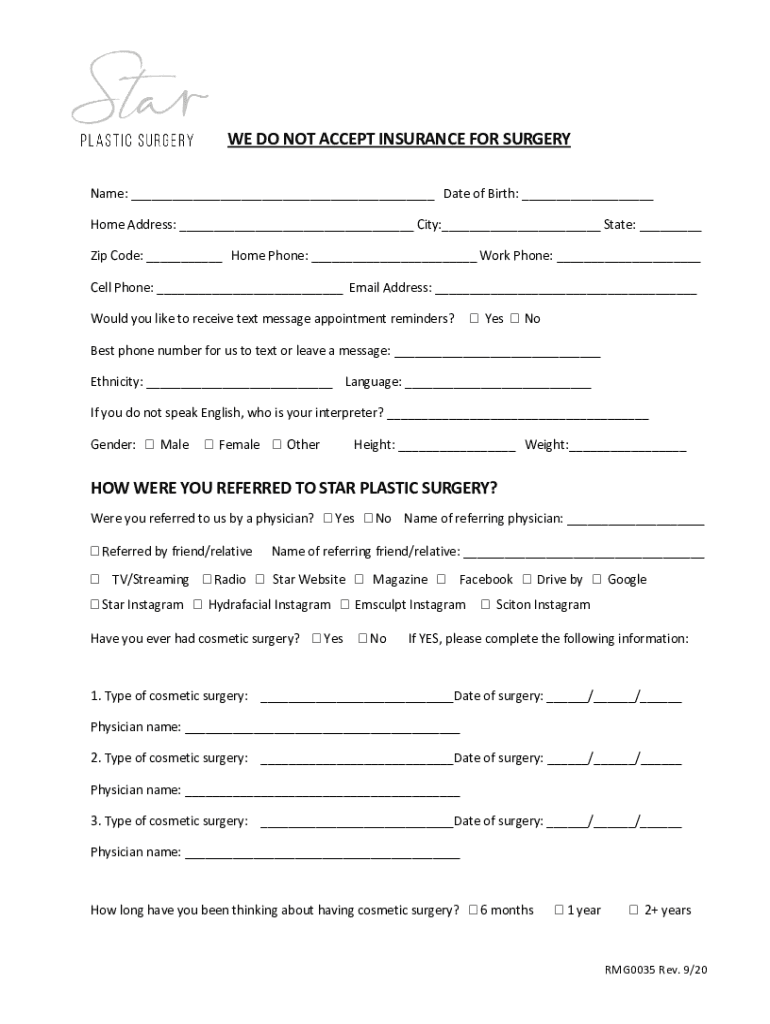 WE DO NOT ACCEPT INSURANCE FOR SURGERY Name: Date of Birth: Home Address: City: State: Zip Code: Home Phone: Work Phone: Cell Phone: Email Address: Would you like to receive text message appointment