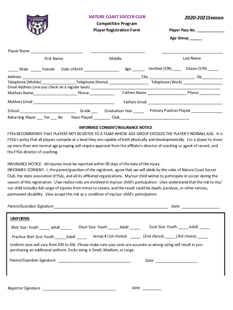NATURECOASTSOCCERCLUB CompetitiveProgram PlayerRegistrationForm20202021Season PlayerPassNo. Age Group Place-name Filename Male Female LastNameMiddleDate of Birth Age Verified (Y/N) Citizen (Y/N) Address