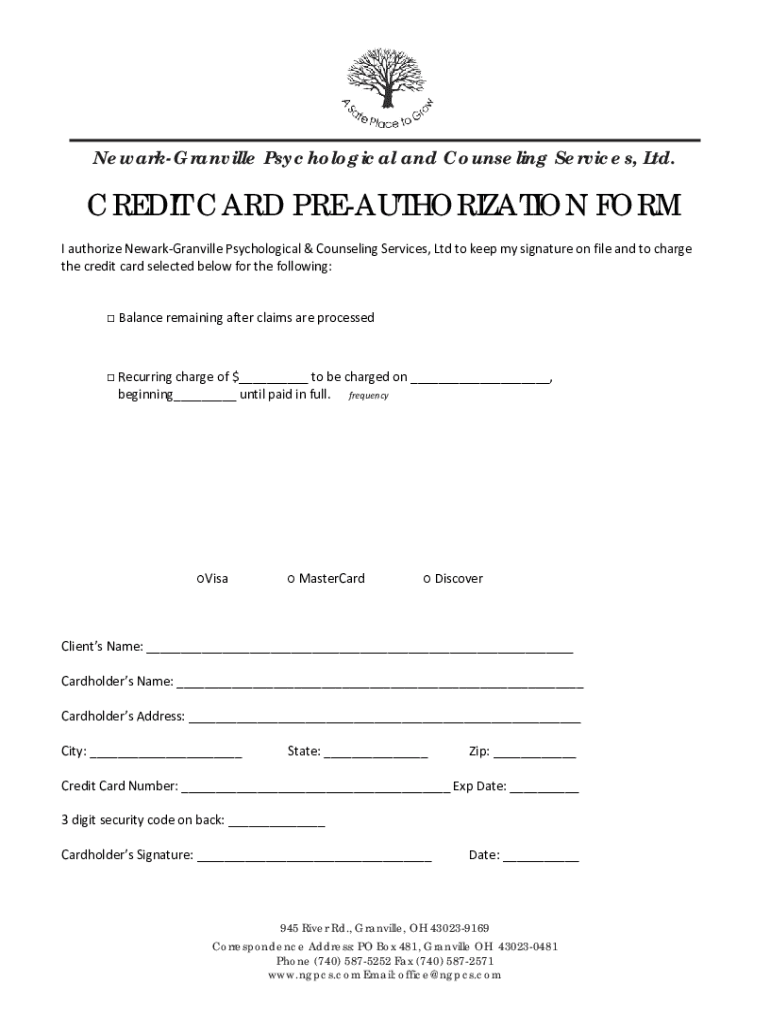 NewarkGranville Psychological and Counseling Services, Ltd. CREDIT CARD PREAUTHORIZATION FORM I authorize NewarkGranville Psychological & Counseling Services, Ltd to keep my signature on file and