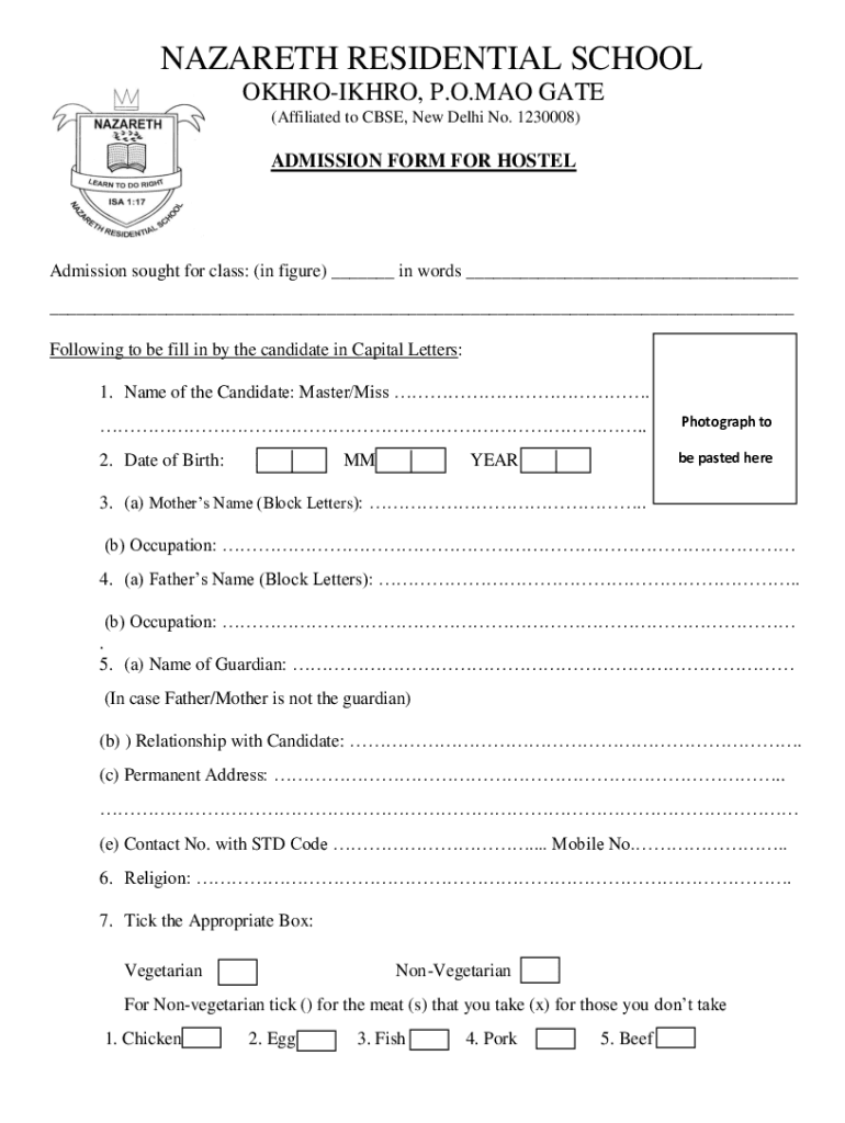 NAZARETH RESIDENTIAL SCHOOL OKHROIKHRO, P.O.MAO GATE (Affiliated to CBSE, New Delhi No. 1230008)ADMISSION FORM FOR HOSTELAdmission sought for class: (in figure) in words Following to be fill in by