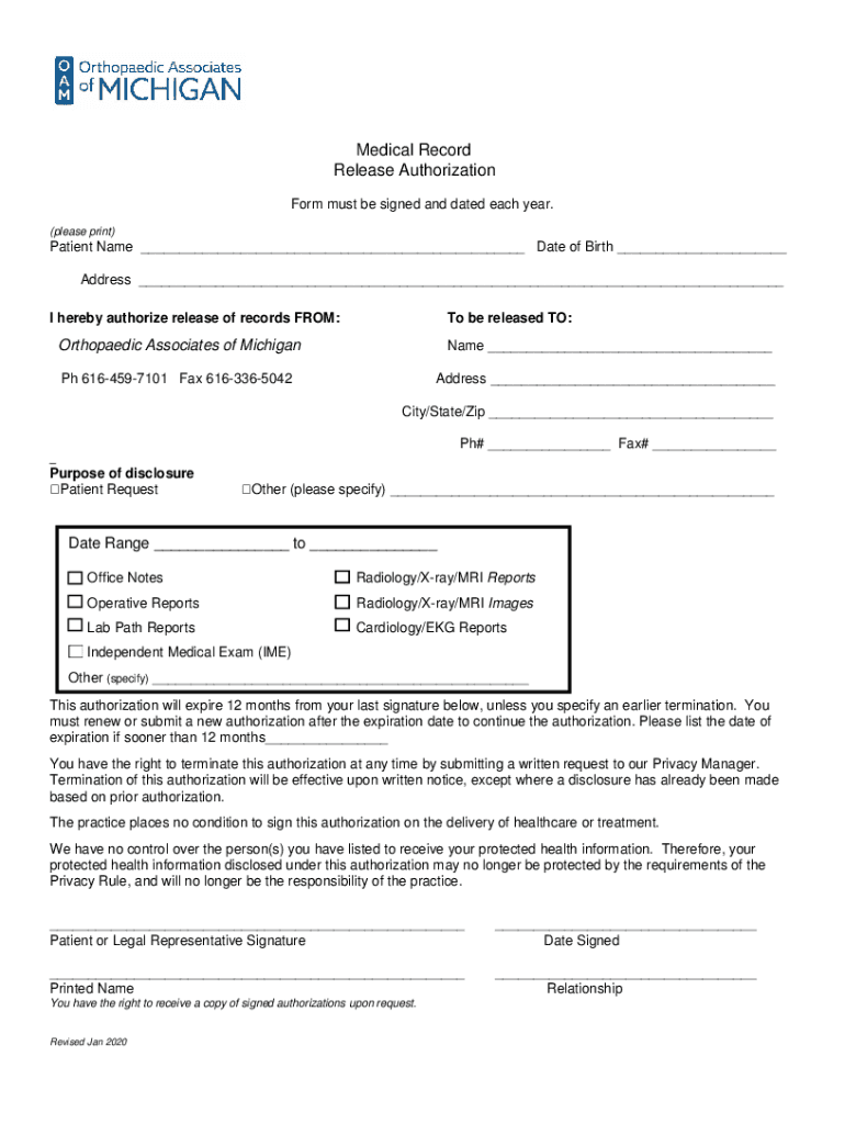 Medical Record Release Authorization Form must be signed and dated each year. (please print)Patient Name Date of Birth Address I hereby authorize release of records FROM:To be released TO:Orthopedic