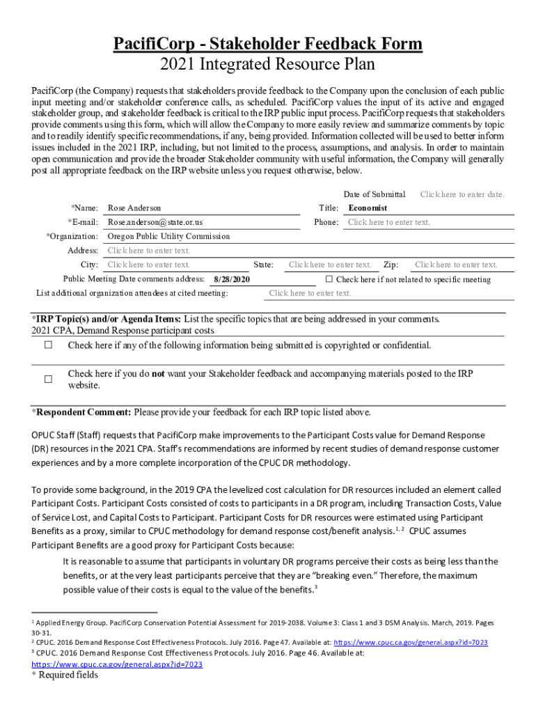 PacifiCorp Stakeholder Feedback Form 2021 Integrated Resource Plan PacifiCorp (the Company) requests that stakeholders provide feedback to the Company upon the conclusion of each public input meeting