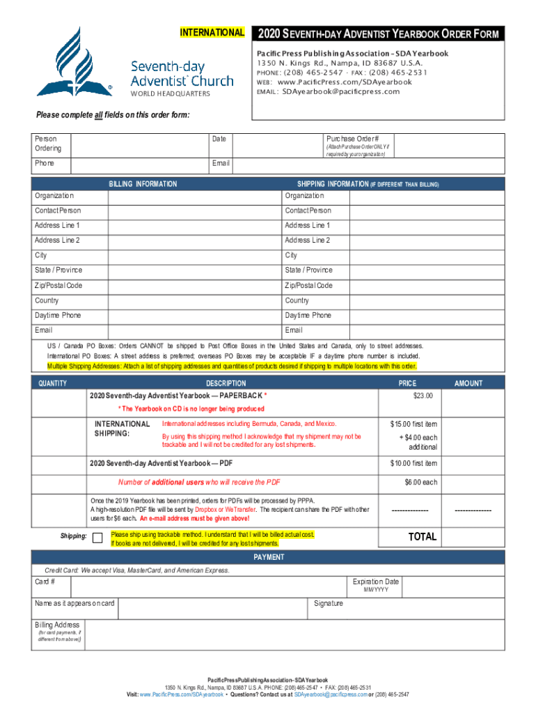 Get the free INTERNATIONAL 2021 SEVENTH DAY ADVENTIST YEARBOOK ORDER FORM