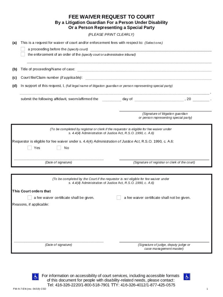 The FEE WAIVER REQUEST TO COURT - Ontario Court s - ontariocourts on is a document that has to be filled-out and signed for specific purposes. Next, it is provided to the actual addressee in order to provide some information of any kinds. The completion and signing is possible in hard copy by hand or using a trusted solution like PDFfiller. These applications help to fill out any PDF or Word file without printing out. It also allows you to customize it for your requirements and put a valid e-signature. Upon finishing, the user ought to send the FEE WAIVER REQUEST TO COURT - Ontario Court s - ontariocourts on to the recipient or several of them by mail or fax. PDFfiller is known for a feature and options that make your document of MS Word extension printable. It includes a variety of options when printing out appearance. No matter, how you'll file a document - physically or electronically - it will always look professional and firm. In order not to create a new document from the beginning again and again, make the original document as a template. Later, you will have a rewritable sample.