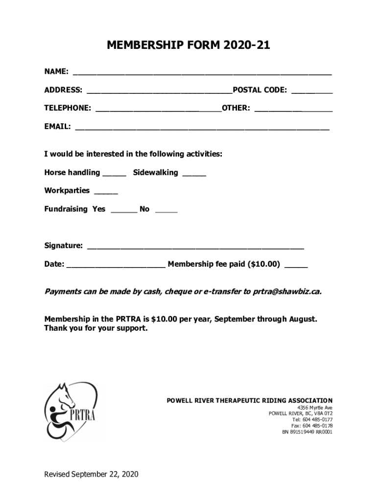 MEMBERSHIP FORM 202021 NAME: ADDRESS: POSTAL CODE: TELEPHONE: OTHER: EMAIL: I would be interested in the following activities: Horse handling Side walking Work parties Fundraising YesNoSignature: