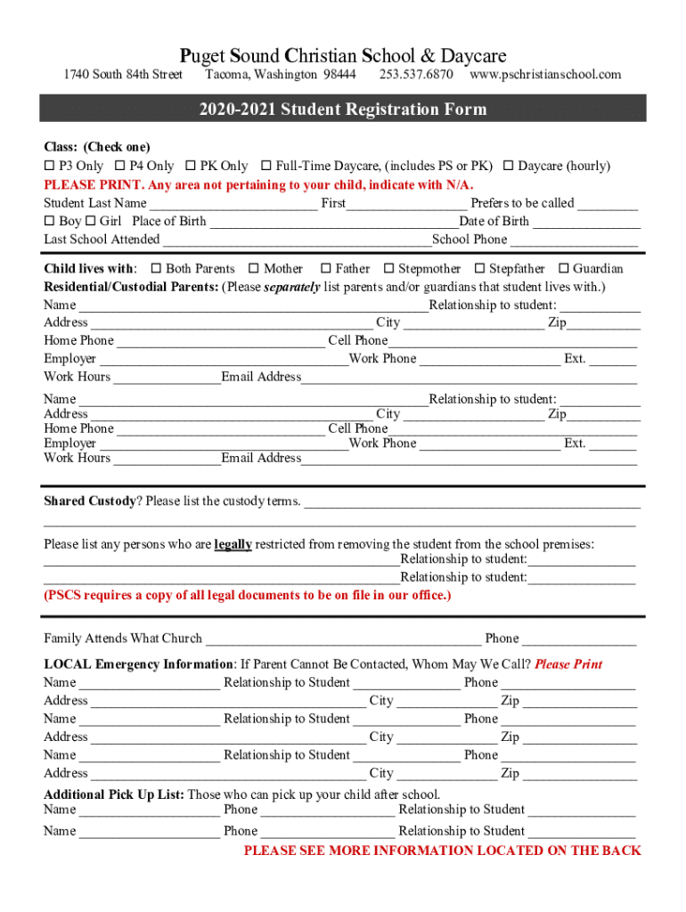 Puget Sound Christian School & Daycare1740 South 84th Street Tacoma, Washington 98444253.537.6870www.pschristianschool.com20202021 Student Registration Form Class: (Check one) P3 Only P4 Only PK Only