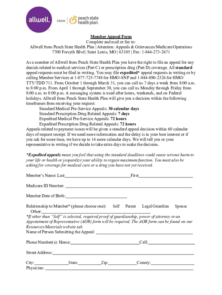 Member Appeal Form Complete and mail or fax to: All well from Peach State Health Plan Attention: Appeals & Grievances/Medicare Operations 7700 Forsyth Blvd Saint Louis, MO 63105 Fax: 18442732671 As
