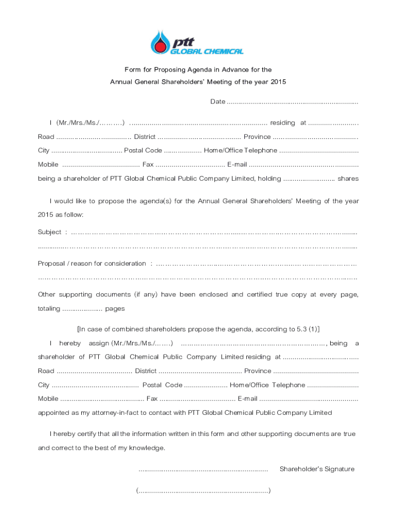Form for Proposing Agenda in Advance for the Annual General Shareholders Meeting of the year 2015 Date .................................................................... I (Mr./Mrs./Ms./.) ....................................................................