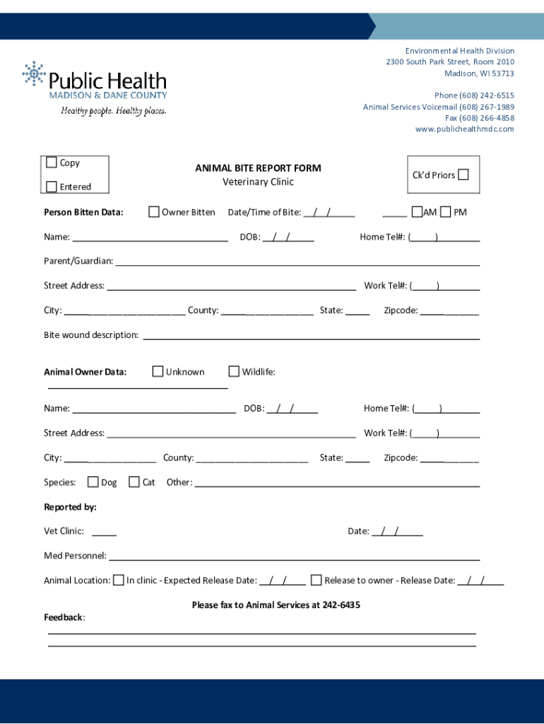 Environmental Health Division 2300 South Park Street, Room 2010 Madison, WI 53713 Phone (608) 2426515 Animal Services Voicemail (608) 2671989 Fax (608) 2664858 www.publichealthmdc.comCopyANIMAL BITE