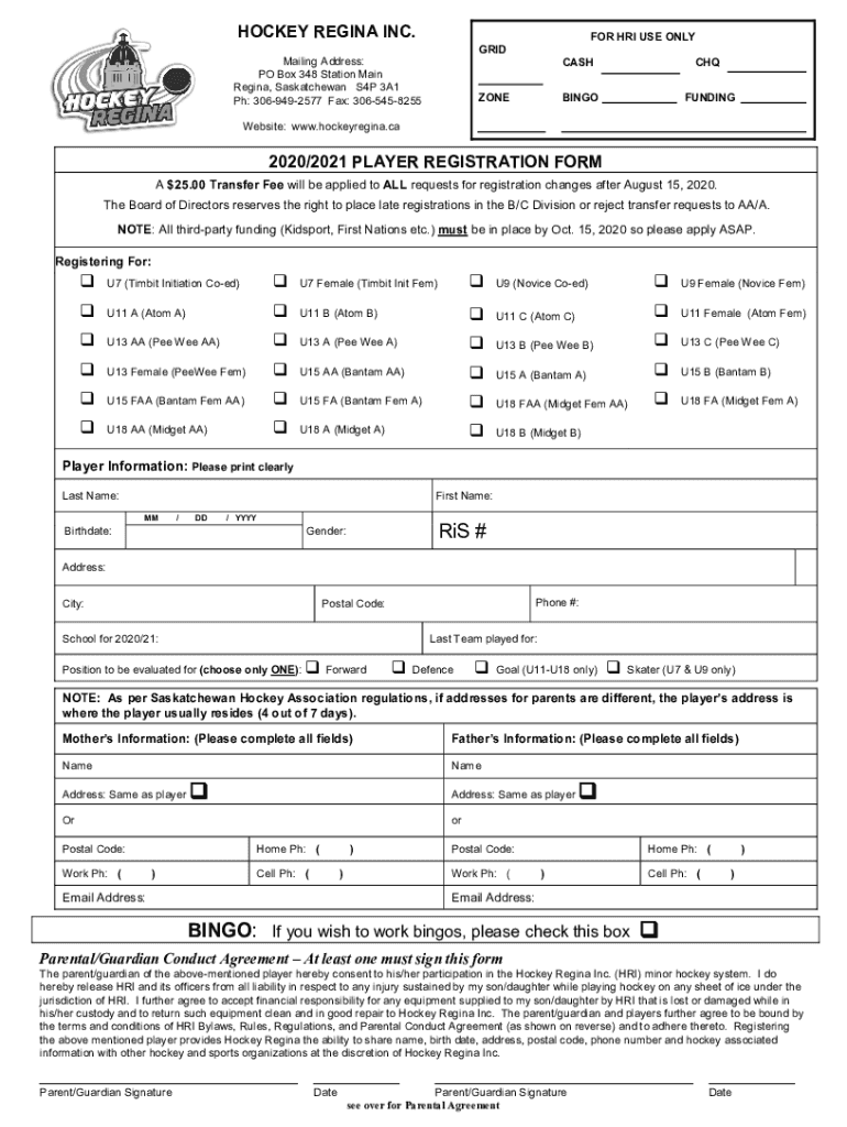 HOCKEY REGINA INC.FOR HRI USE ONLYGRIDMailing Address: