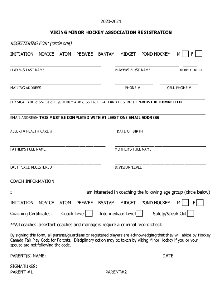 20202021 VIKING MINOR HOCKEY ASSOCIATION REGISTRATIONREGISTERING FOR: (circle one) INITIATIONNOVICEATOMPEEWEEBANTAMMIDGETPOND HOCKEY MF PLAYERS LAST NAMEPLATES FIRST NAME MAILING ADDRESSMIDDLE INITIAL