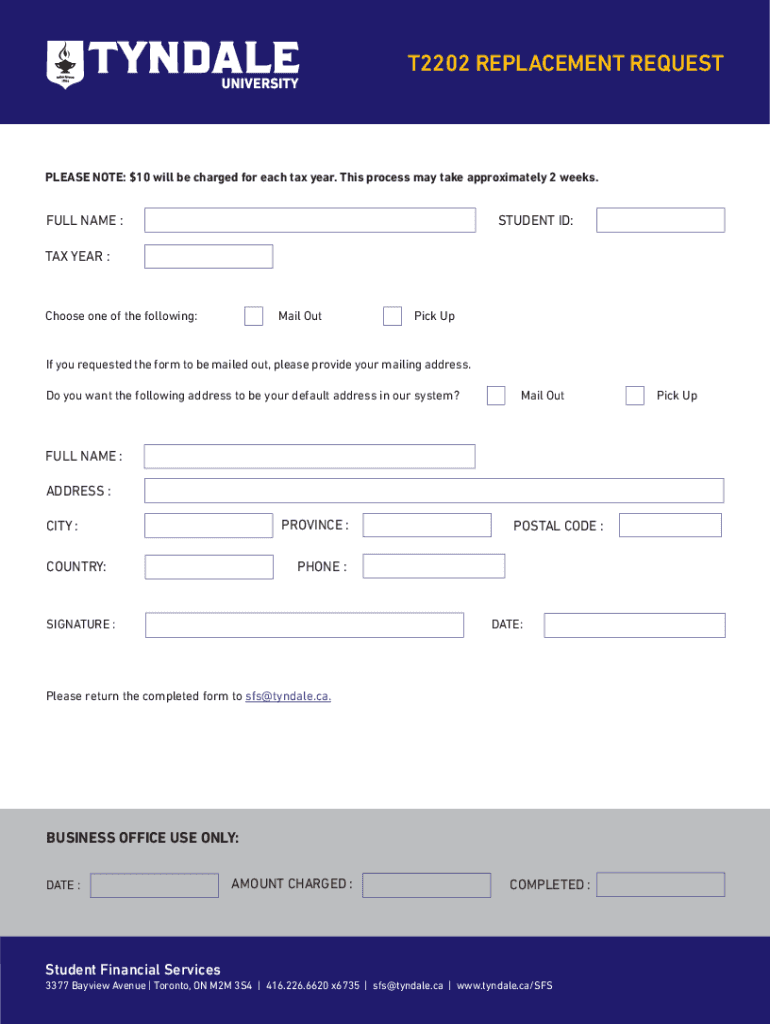 T2202 REPLACEMENT REQUESTPLEASE NOTE: $10 will be charged for each tax year. This process may take approximately 2 weeks. FULL NAME :STUDENT ID:TAX YEAR :Choose one of the following:Mail Nutpick UPI