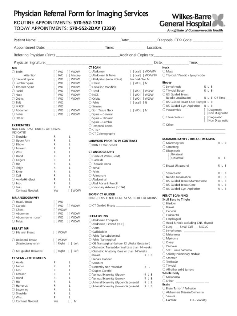 Physician Referral Form for Imaging Services ROUTINE APPOINTMENTS: 5705521701 TODAY APPOINTMENTS: 5705522DAY (2329) Patient Name: Date: Diagnosis ICD9 Code: Appointment Date: Time: Location: Referring