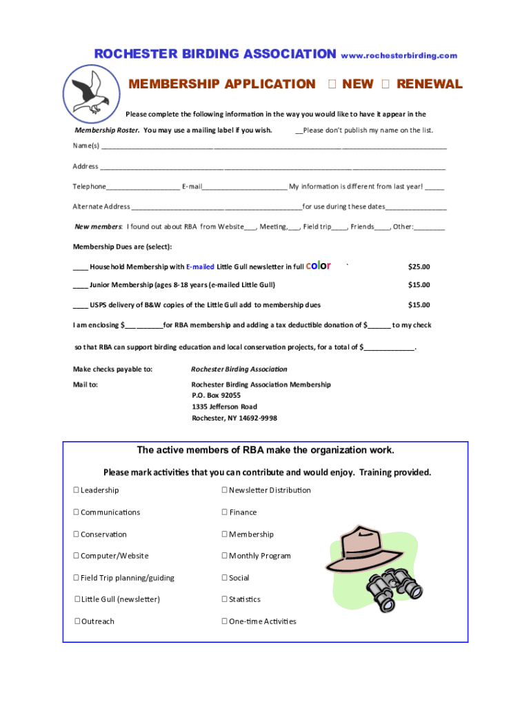 ROCHESTER BIRDING Association.rochesterbirding.membership APPLICATION NEW RENEWAL Please complete the following information in the way you would like to have it appear in the Membership Roster. You