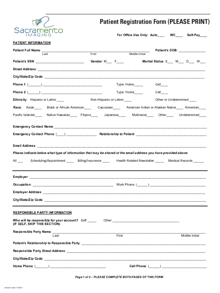 Patient Registration Form (PLEASE PRINT) For Office Use Only: Auto WC Self PATIENT INFORMATION Patient Full Name: LastFirstPatients SSN: Middle InitialGender: M F Patients DOB: Marital Status: S M