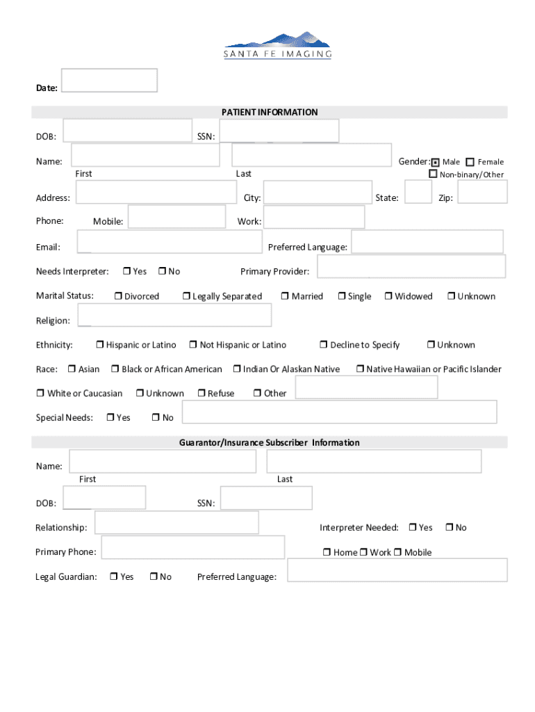 Date: PATIENT INFORMATION DOB:SSN:Name:Gender:: Male Firstly City:Address: Phone:Mobile:State:Female Nonbinary/Other:Work:Email:Preferred Language:Needs Interpreter: Marital Status: Yes No DivorcedPrimary