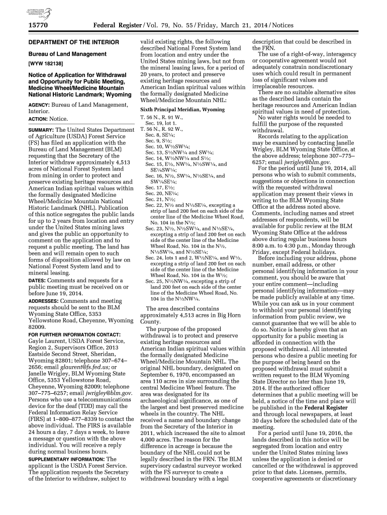 15770 Federal Register / Vol. 79, No. 55 / Friday, March 21, 2014 / Notices DEPARTMENT OF THE INTERIOR Bureau of Land Management WOW 182138 Notice of Application for Withdrawal and Opportunity for