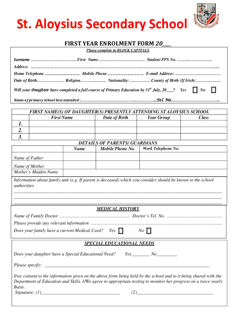 St. Elysium Secondary School FIRST YEAR Enrollment FORM 20 Please complete in BLOCK CAPITALSSurname First Name ... Student PPS No. ..... Address ...... Home Telephone .................................